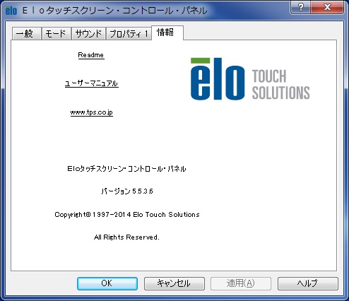 情報タブには、 コントロール・パネルのバージョン表示(ドライバのバージョンともなります) と下記のリンクがあります。 ドライバに同梱されているReadme テキストファイルを表示します。 ユーザマニュアル(このファイル)を表示します。 インターネットのホームページを閲覧できる環境でご使用されている場合、 タッチパネル・システムズ株式会社のホームページを表示します。 ホームページ ページのトップ