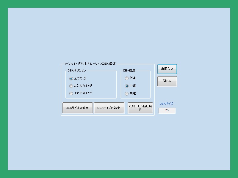 カーソルエッジアクセラレーション・ツール(CEA)は、 タッチスクリーン周縁部でのタッチ位置の補正を行うツールです。 CEAは、周縁部でのタッチ操作をし易くするための特別な機能です。