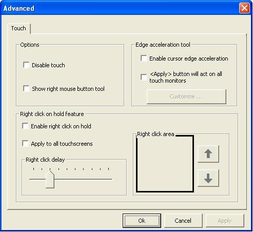 The Advanced window contains the following sections: Options, Right click on hold feature, Edge acceleration tool, and Right click are.