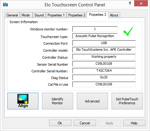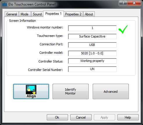 3. Through the Elo Touchscreen Control Panel application in the Properties tab for the individual monitor and clicking the "Align"/"Re-Align" button.