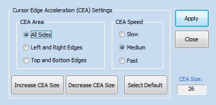 Mouse button emulation mode is selected by selecting the appropriate radio button. It functions as expected from a standard mouse. Draging and highlighting is supported in this mode. More information in the "Mouse Emulation (Drag and Double-click)" section below.