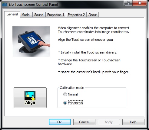 2. Through the Elo Touchscreen Control Panel application in the General tab by clicking the "Align" button.