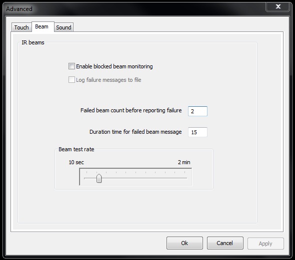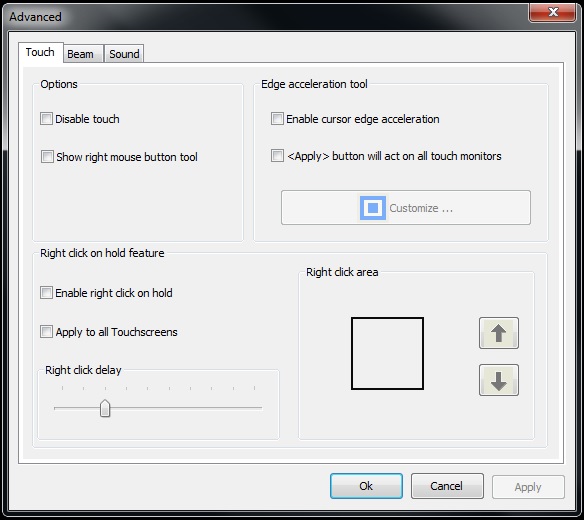 Advanced modifications can be made in the Advanced window by clicking on the Advanced button in the Properties tab. Advanced window will consist of three tabs: Touch, Beam and Sound