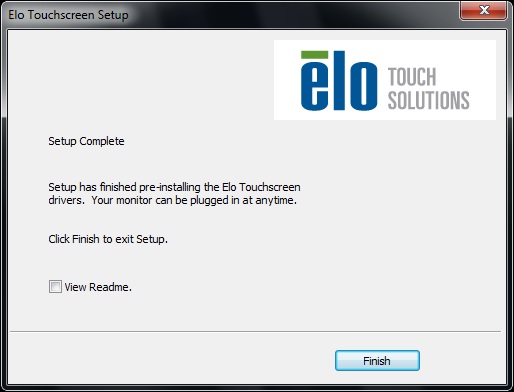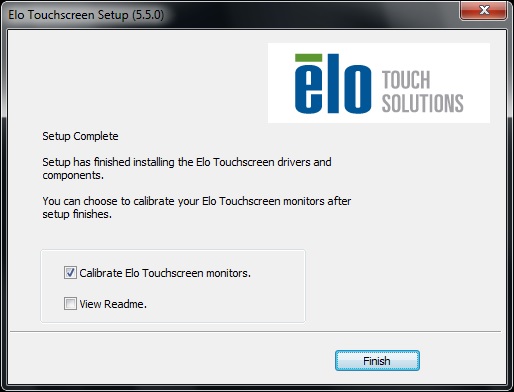 The Setup Complete screen will appear after installation completes. Check the Calibrate Elo Touchscreen monitors. check box if not already selected and click Finish.