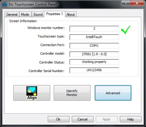 A Properties tab will be created for each touch screen controller installed by EloSetup and for each serial port reserved for a controller, even if that controller is not present. A number will be assigned to each Properties page that is related to the order in which controllers or ports are detected or enumerated. Each Properties page contains information extracted from the touch screen's controller and the system about the monitor, touch screen, controller and internal drive.