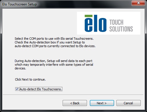 2. Check Auto-detect Elo Touchscreens if your touch monitor serial cable is connected to the computer and the serial cable supports hardware handshaking. If you connect the serial cable later, do not check the Auto-detect Elo touchscreens check box.
