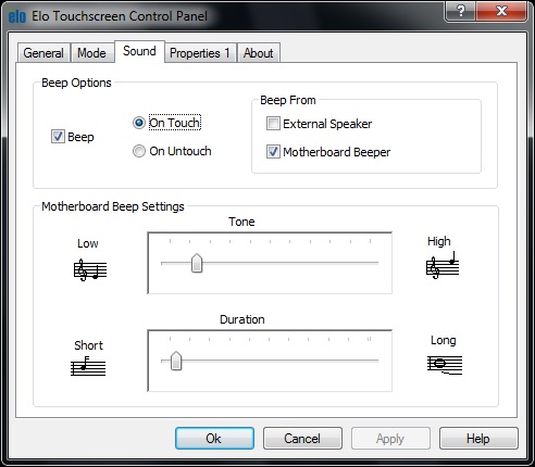 The Sound tab sends a single-frequency tone or "Beep" to the system speaker and/or external speaker each time a valid touch occurs.