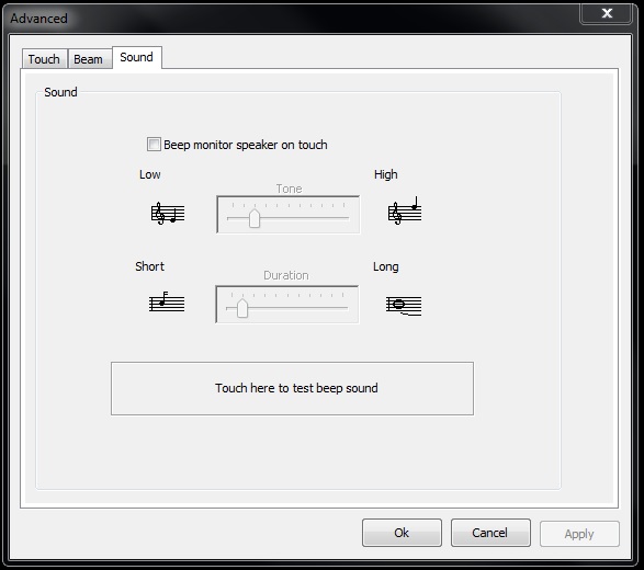 This tab only appears for Carroll Touch (IR) screens that have a separate built in beeper. This feature can be used to provide audio feedback of touches in cases where the screen is placed at some distance from the host computer. Use this tab to configure the sound characteristics of the beeper similar to the "Sound" tab in the main page.