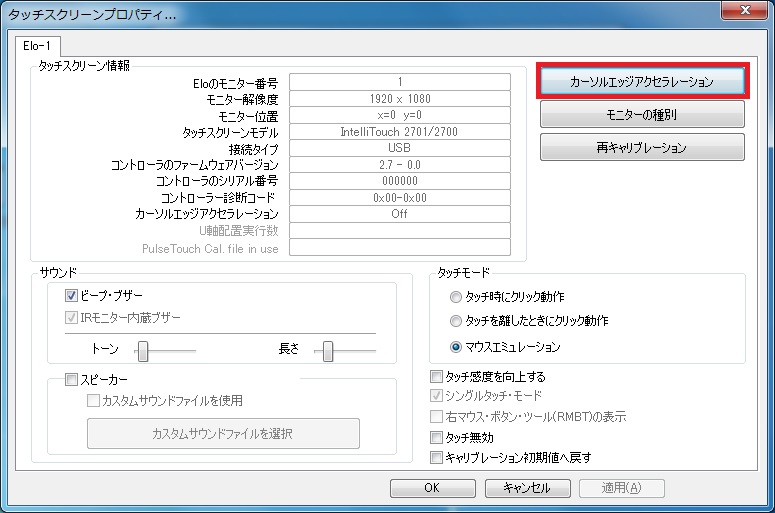 タッチスクリーンプロパティのカーソルエッジアクセラレーションボタンを押して起動します。