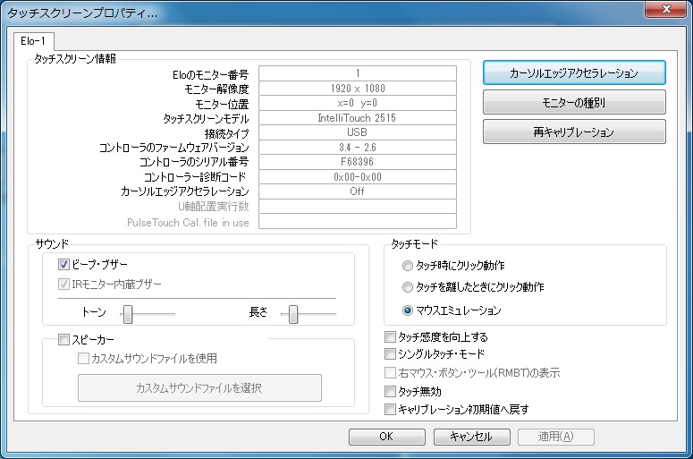 音響波照合方式(Pulse Touch)の場合はタッチスクリーンシリアル番号を表示します。PulseTouch Cal.file in use