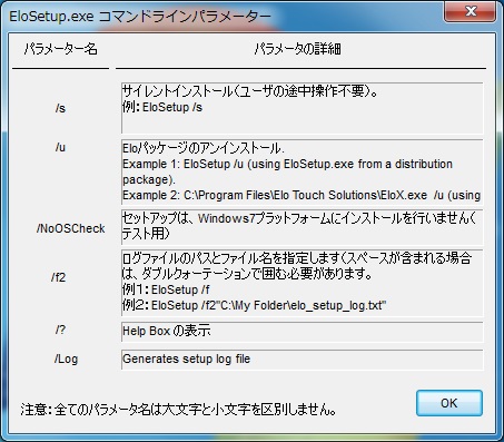 セットアップ・プログラムで使用できる全てのパラメータを閲覧するにはEloSetup.exe /hまたは/?として、実行してください。