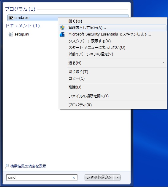 先ほど展開したフォルダに移動してセットアッププログラム(EloSetup.exe)を次のパラメータを付加して実行します。
