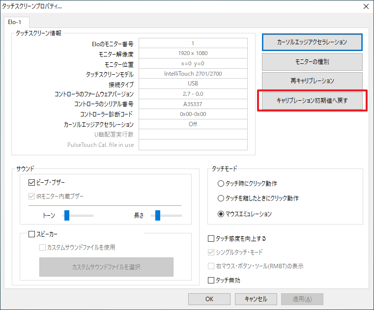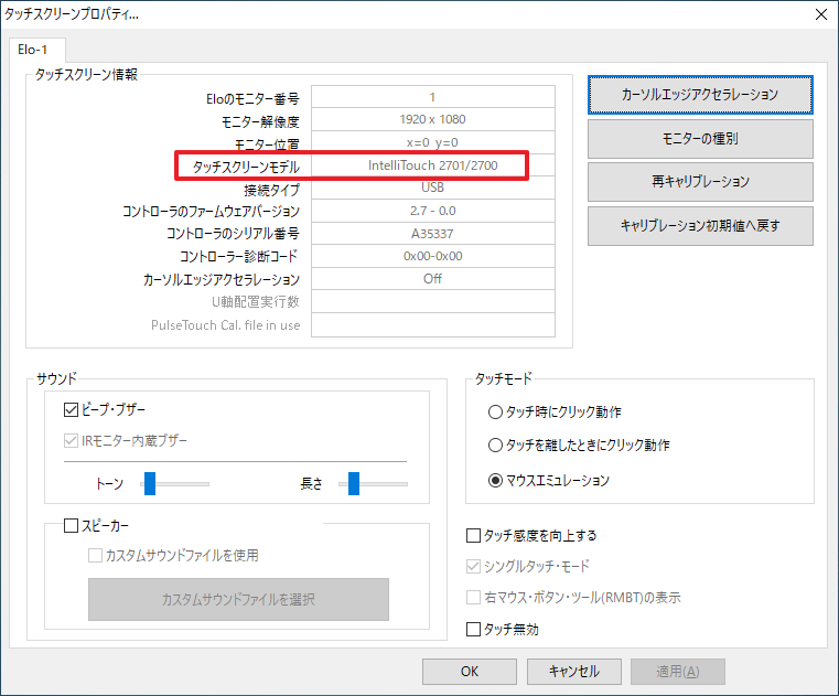 コントローラモデルが表示されていない場合、ハードウェアが正常に動作していない可能性があります。このマニュアルのElo問合せ窓口