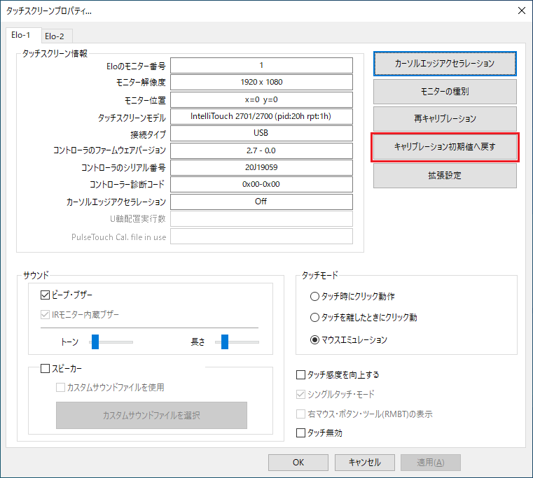 コントローラモデルが表示されていない場合、ハードウェアが正常に動作していない可能性があります。このマニュアルのElo問合せ窓口