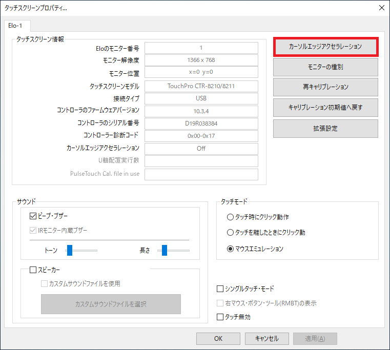 タッチスクリーンプロパティのカーソルエッジアクセラレーションボタンを押して起動します。