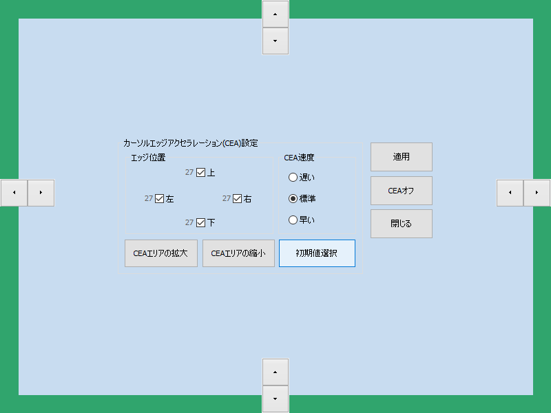 4辺にある▲ボタン:各辺のカーソルエッジアクセラレーションエリアを調整します。