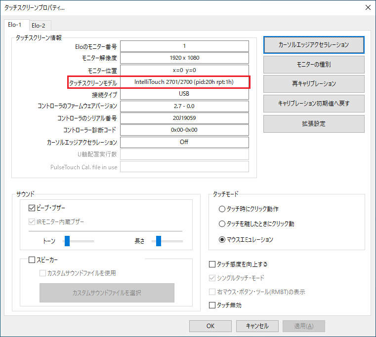 コントローラモデルが表示されていない場合、ハードウェアが正常に動作していない可能性があります。このマニュアルのElo問合せ窓口