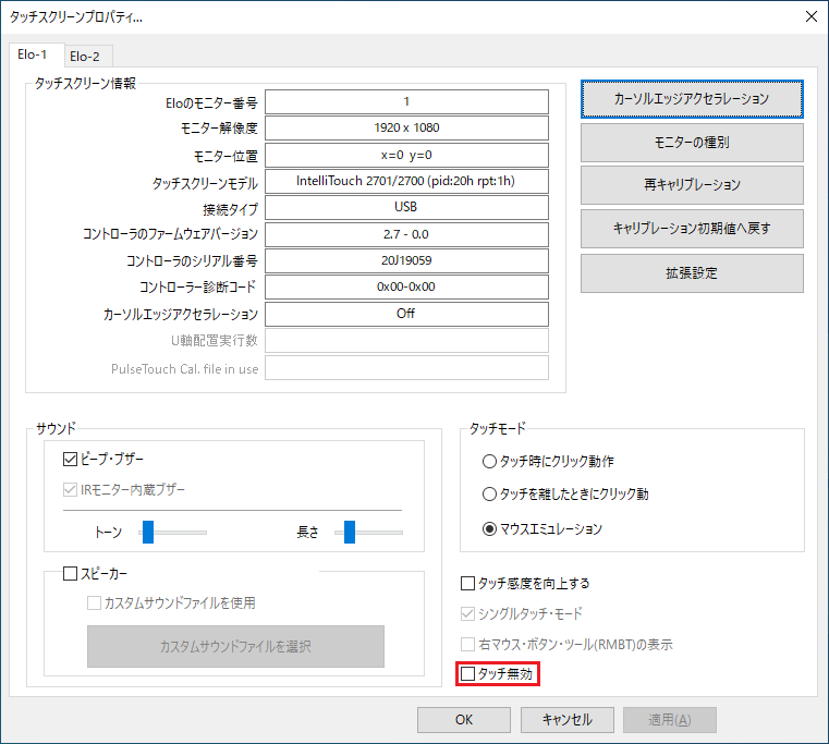 注) Eloドライバをインストールして使用する場合は、Windowsのコントロールパネルにある「タブレットPC設定」は、行わないでください。![]()
