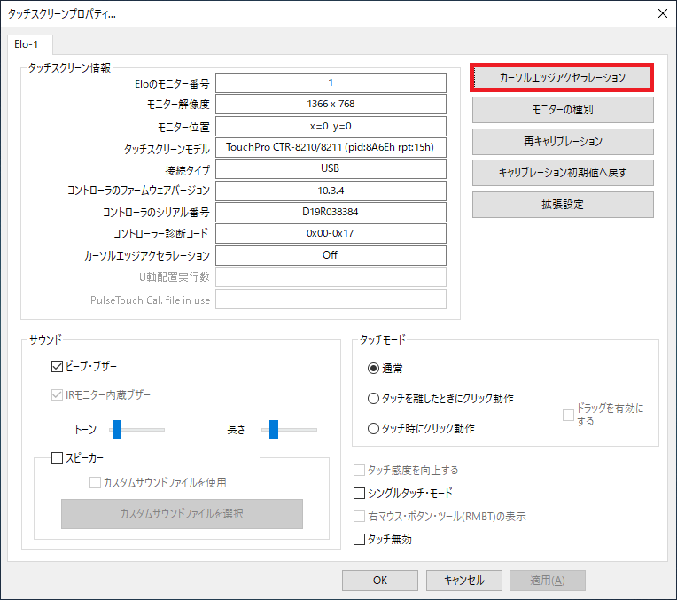 タッチスクリーンプロパティのカーソルエッジアクセラレーションボタンを押して起動します。
