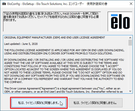 使用許諾契約書に同意頂けない場合は[私は、ライセンス契約に同意しません。]ボタンをクリックし、ドライバのセットアップを直ちに終了してください。