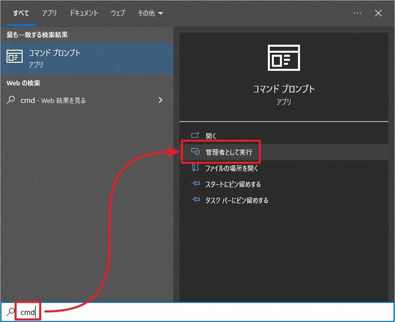 - Windowsキーを押して、「cmd」と入力し、管理者として、コマンド・プロンプトを開きます。