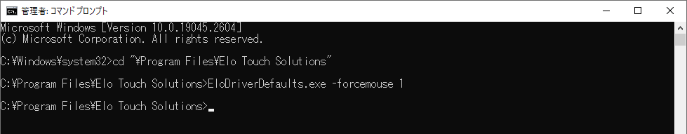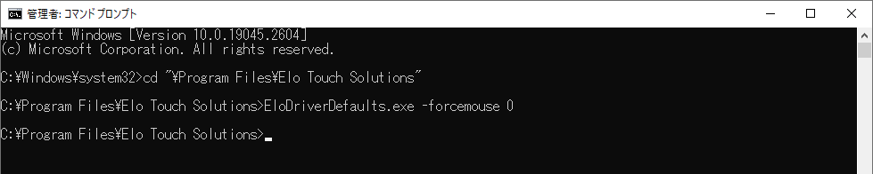 - カレント・ディレクトリをドライバがインストールされているフォルダに変更して、「EloDriverDefaults.exe -forcemouse 1」を実行すると、マウス・エミュレーション・モードに変わります。