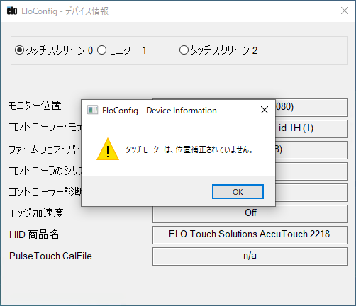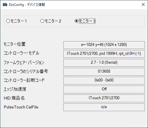 - コントローラのシリアル番号には、タッチパネル・コントローラのシリアル番号情報が表示されます。