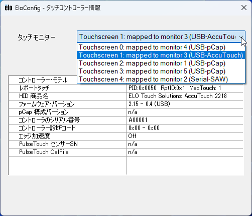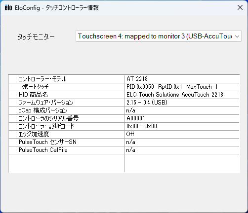 - 接続されているタッチスクリーン・コントローラーの情報を表示します。