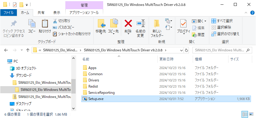 - フォルダ「SW603125_Elo_Windows_MultiTouch_Driver_v9.2.0.8」を開くと、「Setup.exe」があります。