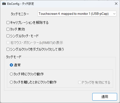 このチェックボックスをチェックして、「適用」ボタンをクリックすると、2点タッチ以上の製品でタッチ入力を1点タッチに変更します。動作モードはデジタイザモードのままです。