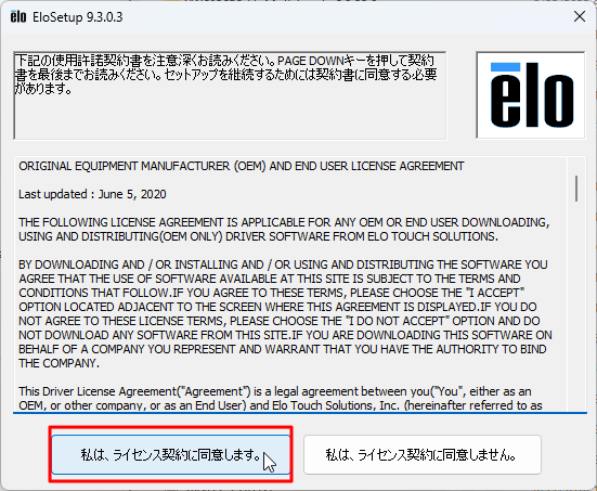 使用許諾契約書に同意頂けない場合は[私は、ライセンス契約に同意しません。]ボタンをクリックし、ドライバのセットアップを直ちに終了してください。