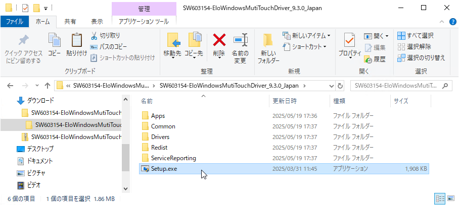 - フォルダ「SW603154_Elo_Windows_MultiTouch_Driver_v9.3.0.8」を開くと、「Setup.exe」があります。