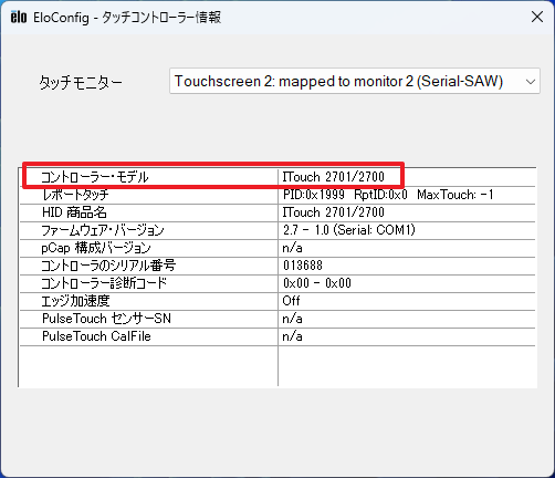 コントローラモデルが表示されていない場合、ハードウェアが正常に動作していない可能性があります。このマニュアルのElo問合せ窓口