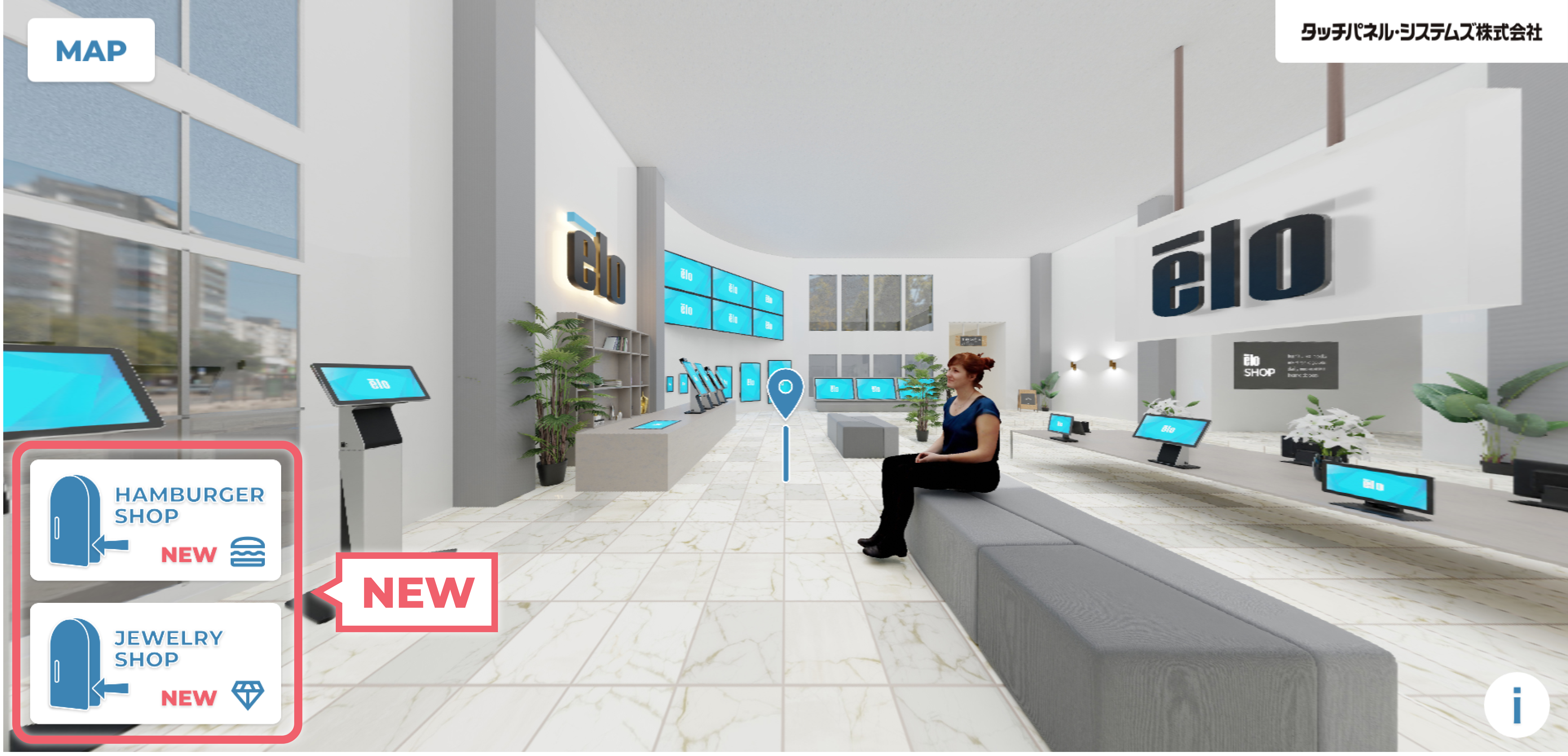 ・既存のショールーム・レストラン・店舗と、今回追加されたハンバーガーショップとジュエリーショップのバーチャル空間があります。