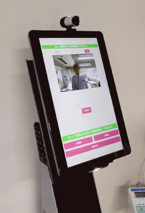 新しい受付装置は、患者様が装置の前に進むだけでカメラが瞬時に患者様の顔を読み取り、データベースに登録されている情報と照合して患者様のデータを画面に表示し、同時に装置と連動している体重計で測定された体重のデータも画面上に表示します。顔認証の他にも、バーコードリーダーによる患者様のデータの読み取りにも対応しています。