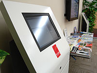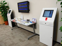 タッチパネル式だとマウス・キーボードを設置する端末より操作性がよく、お客様がすみやかに欲しい情報を引き出せるという利点があります。 またさらに自立型のキオスク端末を利用することで、座って利用する端末に比べてひとり一人のお客様の操作時間を長引かせることなくご利用いただけます。 端末を利用したいお客様はたくさんいらっしゃるので効率よく運用できることは重要なことです。