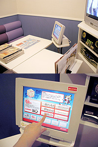 センターサーバー、CD-R、12.1型LCDタッチモニター+クライアントPC タッチモニターで曲を選択し、録音します。視聴や編集、最大30回の取直しが可能です。録音されたデータはクライアントPCからセンターサーバーに送られます。 ラベルデザインを選択した後「CDをつくる」をタッチするとセンターサーバーからCD-Rを稼動しオリジナルCDを作成します。 できあがったCDは会計時にフロントにて受領します。
