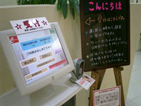 もともと出店にあたってトータルコストを考慮し、受付には人を置かずタッチモニターを置くことを検討。 以前は15.0インチの組込み型タッチモニターを平置きで利用。 子供や高齢者に画面が見づらい、耐久性に欠ける等の問題あり。諸問題を解決すべくTPS 17.0型デスクトップ型タッチモニターを導入。 デスクトップ型で大画面、超音波表面弾性波方式の高耐久性により好評いただいている。