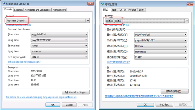コントロールパネルの「地域と言語」の「形式」設定を「日本語(日本)」以外の設定に変更して適用した後、もう一度、「日本語(日本)」設定にしてください。