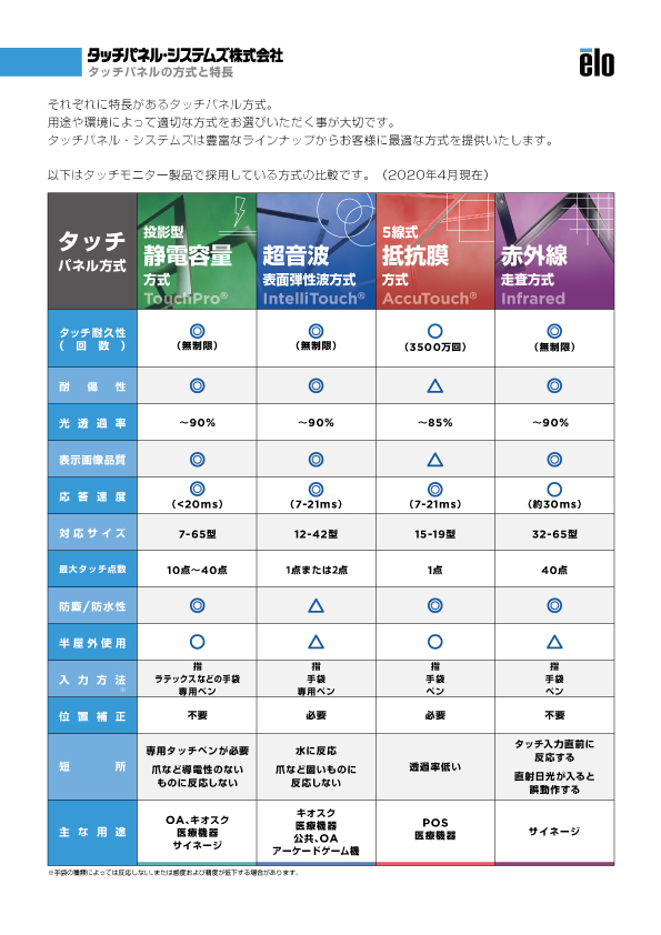 タッチパネルにはいくつかの方式があり、それぞれに特長があります。快適にお使いいただくには、用途や環境によって適切な方式をお選びいただく必要があります。