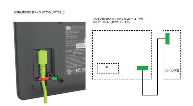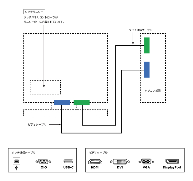 映像信号入力端子は各種取り備えております。ご利用になるタッチモニターが備えている映像信号入力端子を製品カタログでご確認の上、それに合ったインターフェースを備えたPCをお 選びください。